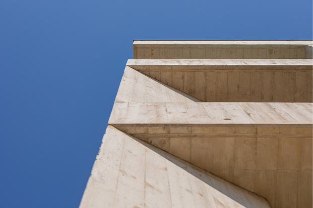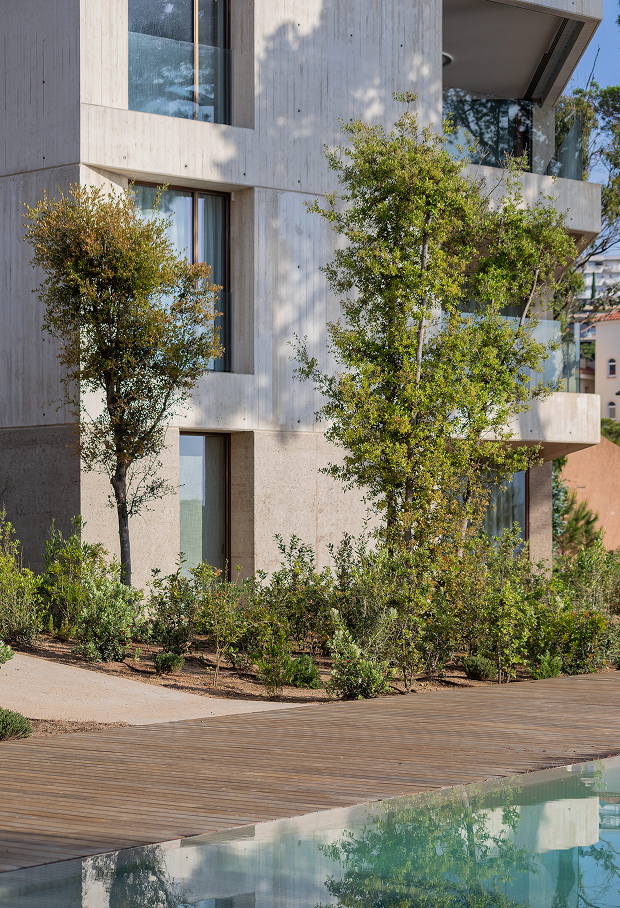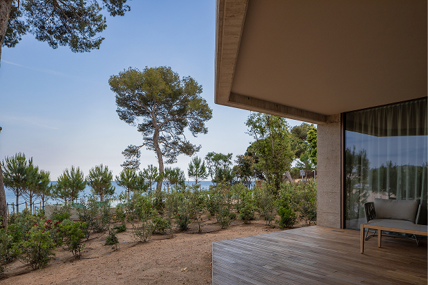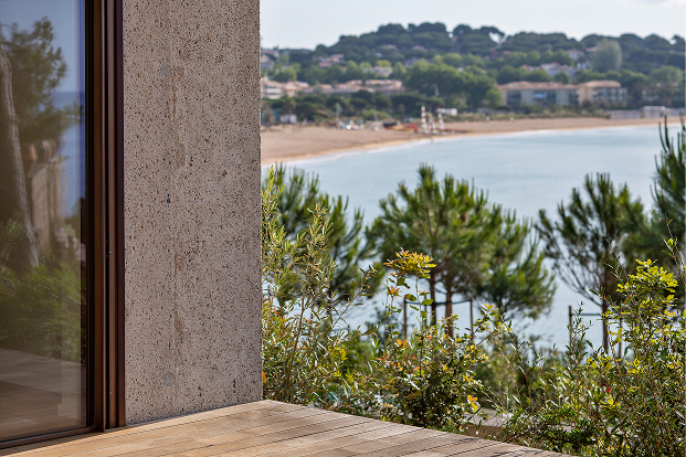 Hand-applied facade finishes in warm sand tones, where the architecture blends seamlessly into the coastal landscape
