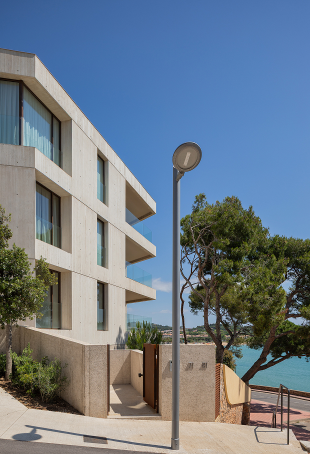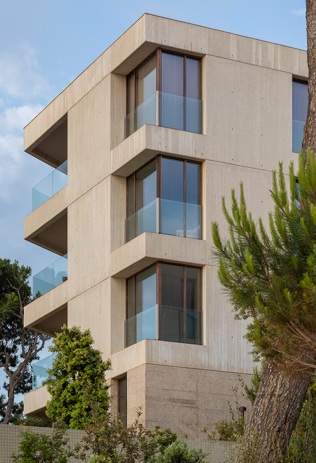 The exposed architectural concrete facades in a warm sand tone, built by the experts at Estructura Ultra, harmonize with the character of the local beaches.